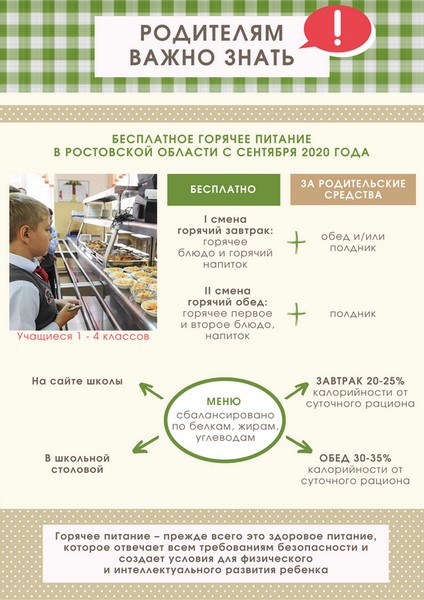 В общеобразовательных организациях Тацинского района с 1 сентября 2020 года 1325 учащихся 1-4 классов будут получать бесплатные горячие завтраки.