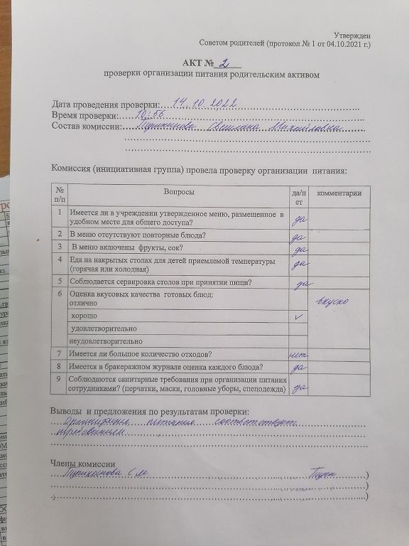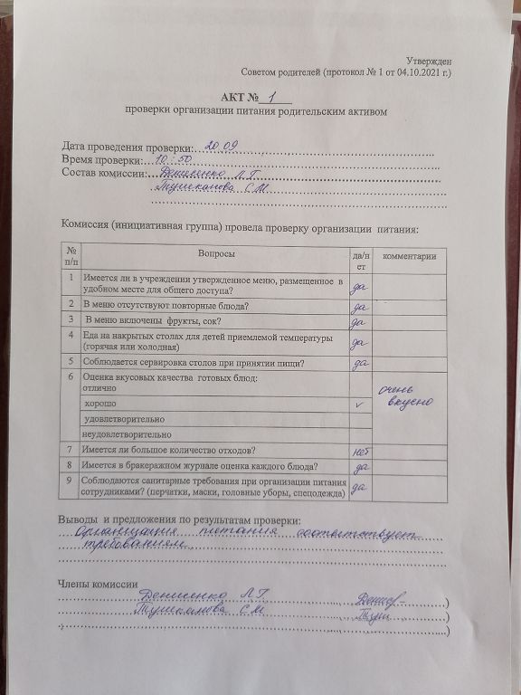 26 января представителями родительского комитета была осуществлена проверка работы пищеблока. Родители проверили санитарное состояние пищеблока, соответствие приготовленных блюд перспективному меню, также проверили выход блюд и их вкусовые качества. Также были проверены сроки хранения продуктов и условия их хранения. По результатам проверки был составлен акт. Нарушений не выявлено.