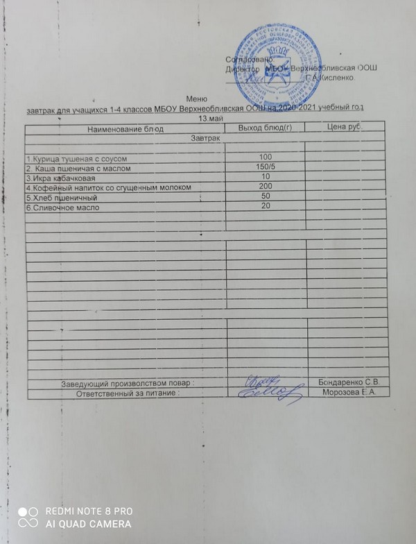 В МБОУ Верхнеобливской школе был осуществлён родительский контроль организации горячего питания обучающихся 1-4 классов. Комиссия родителей проверила соответствие приготовленных блюд утверждённому меню, санитарное состояние обеденного зала.