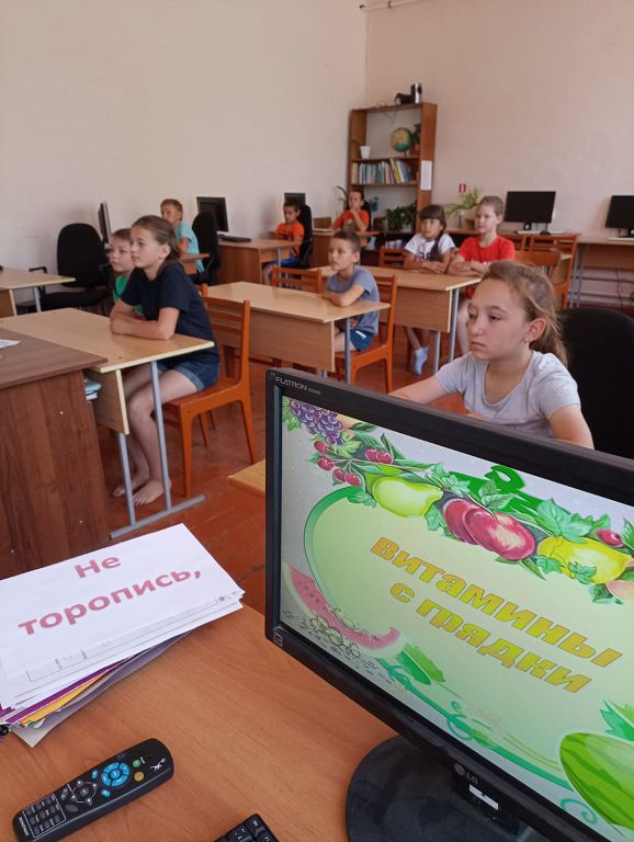 Здравствуй лагерь, мы снова все вместе и радуемся новому дню! Утро наше началось с зарядки, минутки здоровья по теме «Витамины на грядке». Мы посмотрели красочную презентацию и поучаствовали в ее обсуждении.