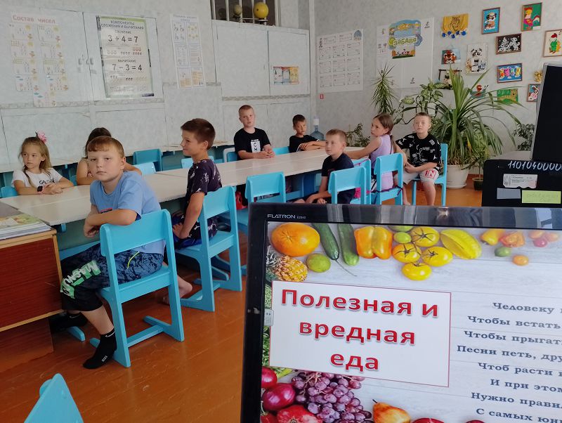 Начался день как обычно с веселой утренней зарядки. Затем все отправились на минутку здоровья, где поговорили о «Полезной и вредной еде».