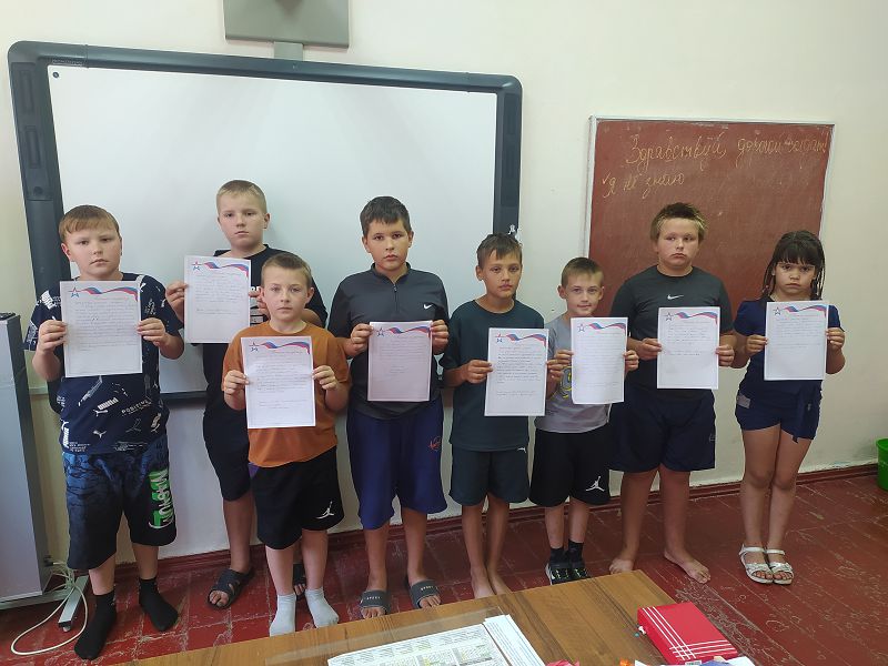 Семнадцатый день в лагере прошел под названием «Орленок-доброволец». Начался день как обычно с веселой утренней зарядки. Затем мы отправились на минутку здоровья, где посмотрели видеоролик о полезной и вредной еде. Вкусно позавтракав, все приняли участие в акции «Мы – Орлята – добровольцы». Ребята написали письма солдатам СВО, поздравили их с наступающим праздником «Днем Семьи, Любви и Верности».