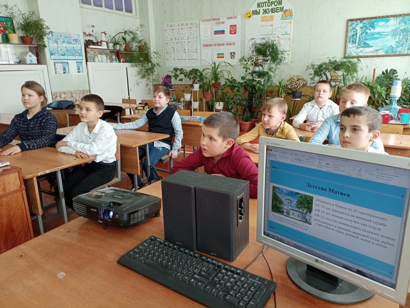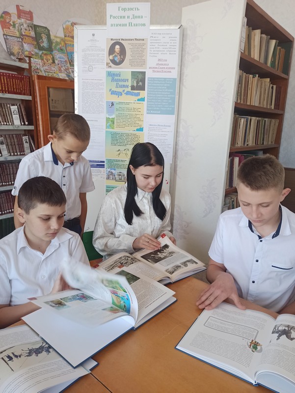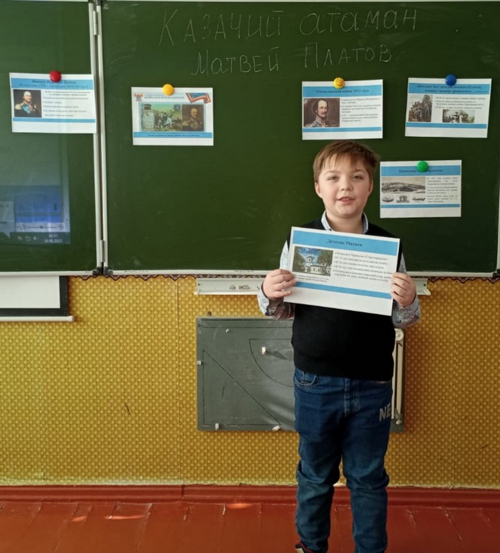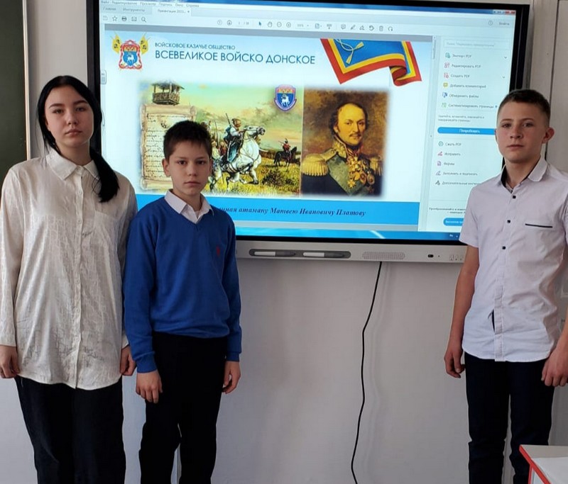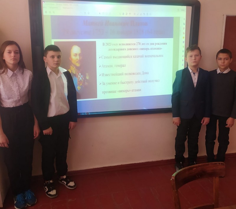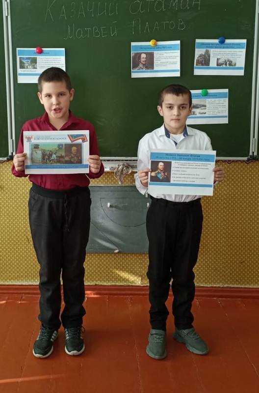 26 января были проведены классные часы, библиотечный урок, памяти атамана Матвея Ивановича Платова, в которых приняли участие учащиеся 1-9 классов. Классные руководители подготовили и провели классные часы «Герой Платов-пример храбрости» (1-2 кл. Н.Н.Ольховатова), «Казачий атаман Платов Матвей» (3-4 кл. Ляушневич Т.Н.), «Атаман Платов –легенда Дона и России» (6 кл. Тупеко С.М.), «Матвей Платов-гордость Донского казачества»(7 кл. Елисеева В.А.), «Платов- отважный сын Дона» (8 кл. Цыбулько Н.И.), «Вихорь-атаман Матвей Платов» (9 кл. Федотова Е.В.).Морозова Е.А. провела библиотечный урок «Гордость России и Дона- атаман Платов» для учащихся 5-7 классов.