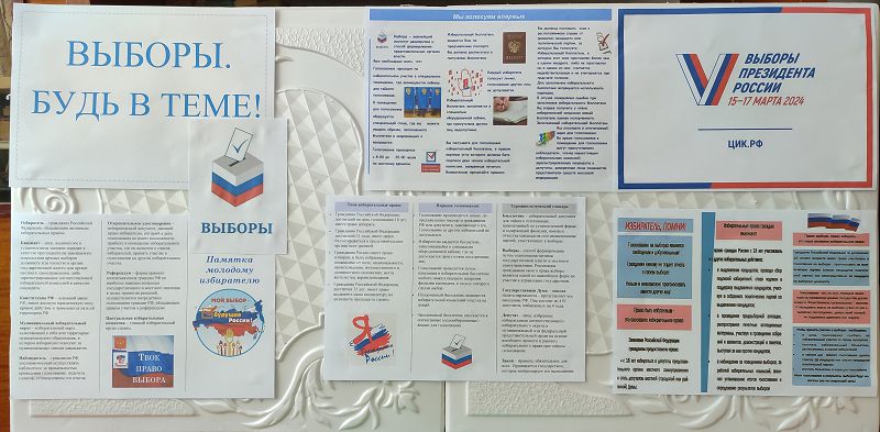 В школьной библиотеке оформлена информационная выставка «Выборы. Будь в теме!», на которой расположены материалы по истории выборов, о процедуре голосования.