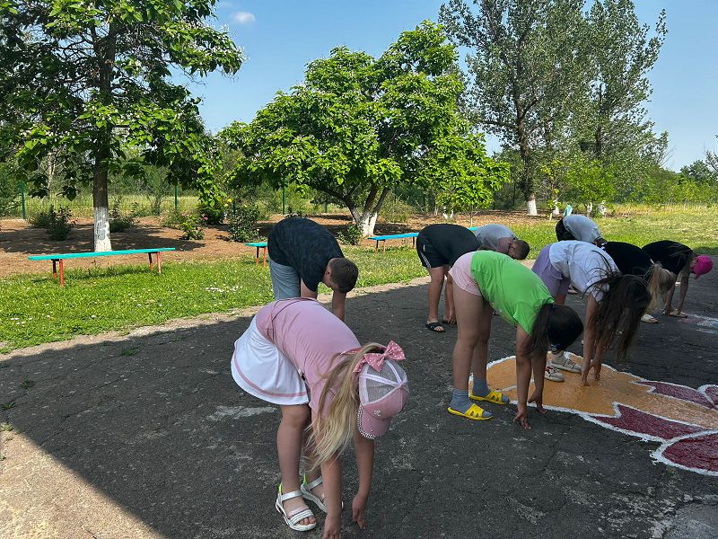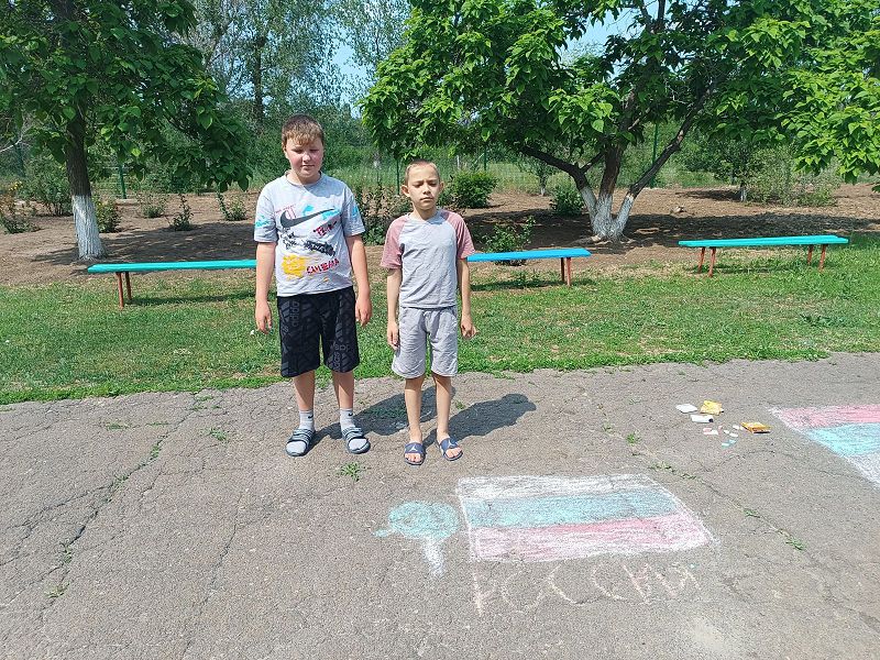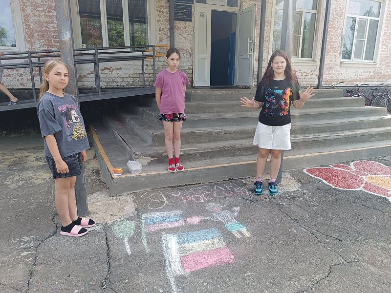 После завтрака, в преддверии Дня России, в лагере провели творческую работу «Конкурс рисунков на асфальте «Моя Россия»». Приняли участие в коллективно творческом деле «Моя Россия – моя страна».