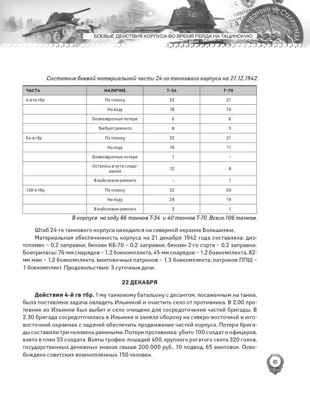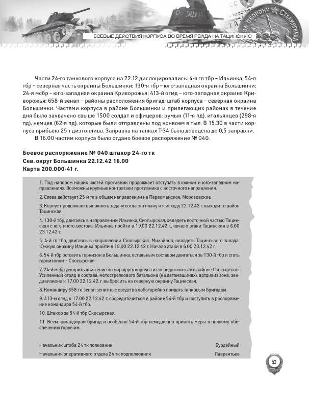 24 танковый корпус продолжает выполнять задачу согласно поставленному плану и к исходу 22 декабря 1942 года выходит в район Скосырской. Представляем вашему вниманию описание боевого пути корпуса за 22 декабря 1942 года из книги Андрея Васильевича Харитонова «Тацинский танковый рейд 1942» .