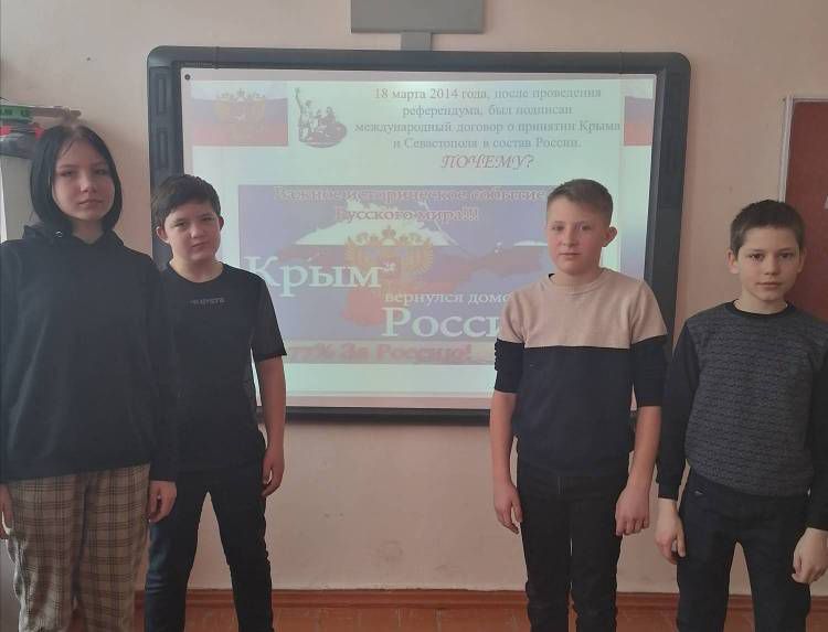 17 марта в начальных классах было проведено мероприятие, посвящённое воссоединение Крыма с Россией "Крымская весна". Ребята познакомились с историей воссоединения Крыма с Россией, рассказали стихи, затем приняли участие во Всероссийском онлайн уроке Русская Весна